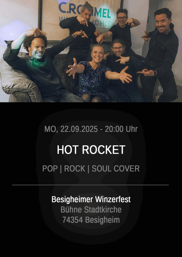 Willkommen bei Hot Rocket – Ihrer Coverband für eine galaktische Musikreise durch Rock, Pop und Soul! Das facettenreiche Repertoire reicht von Adele und Beyoncé über Kool and the Gang, Chic, Bruno Mars und Lenny Kravitz bis hin zu Jamiroquai. Seit 15 Jahren bringt die Band eine Mischung aus kreativer Energie und Leidenschaft auf die Bühne und Tanzflächen. Bei Hot Rocket sind sowohl die Tanzwütigen als auch die Musikliebhaber an der richtigen Adresse – von den allseits bekannten Welthits bis hin zu seltenen Song-Perlen. Hot Rocket ist mehr als eine Band – Sie sind Ihre musikalischen Wegbegleiter auf einer Reise durch das Beste des Musikuniversums. Gemeinsam schaffen Sie eine Atmosphäre, die Ihr Publikum in Bewegung versetzt und machen aus Ihre Veranstaltung, egal ob Firmenevent, Sommerfest oder Hochzeit, ein unvergessliches Erlebnis.