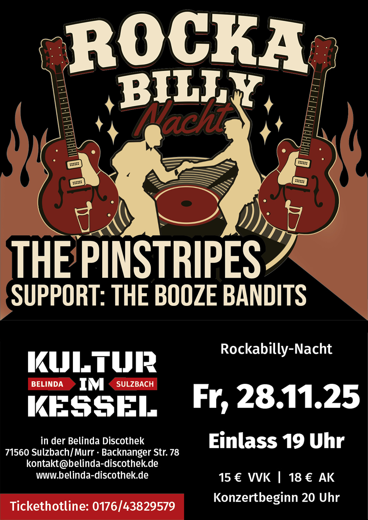 VVK: 15€ | AK: 18€ ROCKABILLY Nacht BelindaSchloßgasse 17, 71560 Sulzbach an der MurrFreitag, 28. November 2025 Doors: 19:00 UhrBeginn: 20:00 Uhr The Booze Bandits Packt die 50er Klamotten…